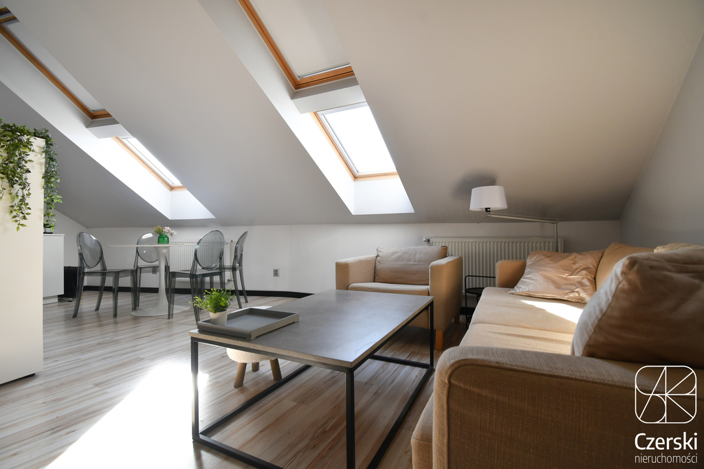 Mieszkanie pięknie doświetlone, z północno-zachodnią ekspozycją okien (5 okien połaciowych). Niewątpliwym atutem jest wspaniały widok z okien na wieżę Kościoła Mariackiego i Kopiec Wandy.