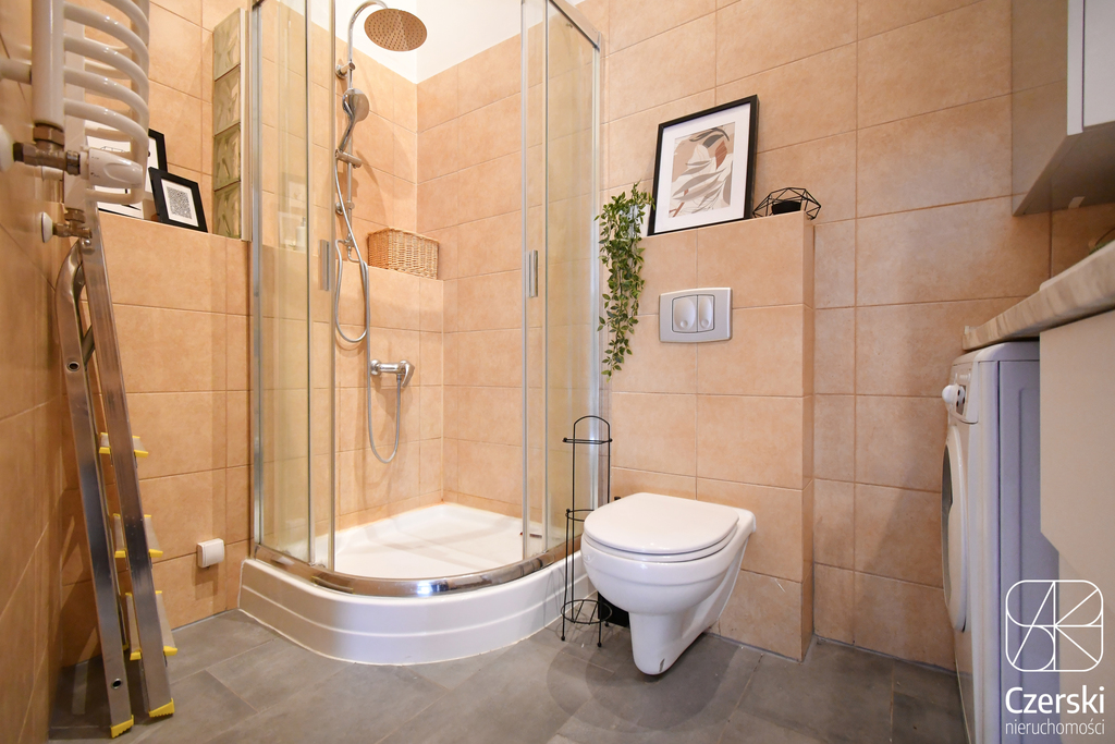 Łazienka: duży prysznic, umywalka w zabudowie, lustro, WC, pralka, liczne szafki.