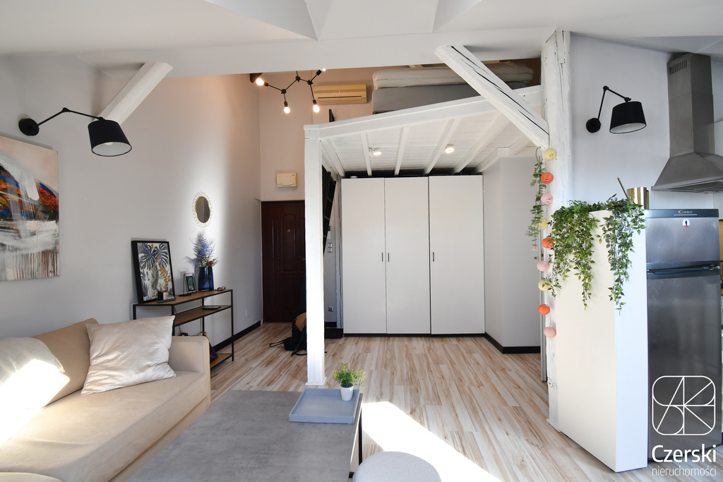 Prezentowane mieszkanie usytuowane jest na czwartym piętrze zadbanej, zabytkowej kamienicy z 1910 roku. W skład mieszkania wchodzi duży salon z aneksem kuchennym, antresola z przestrzenią sypialnianą oraz łazienka. Mieszkanie bardzo wysokie – 4m.