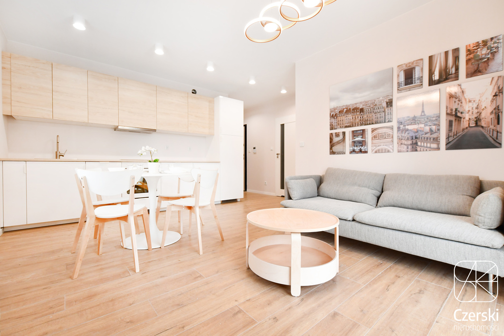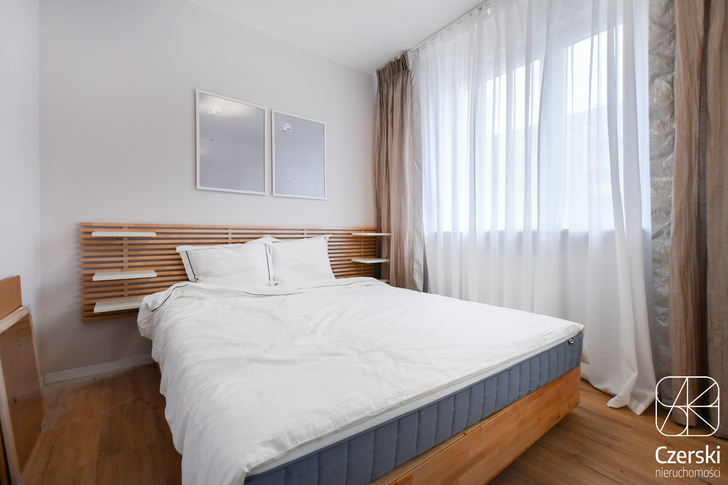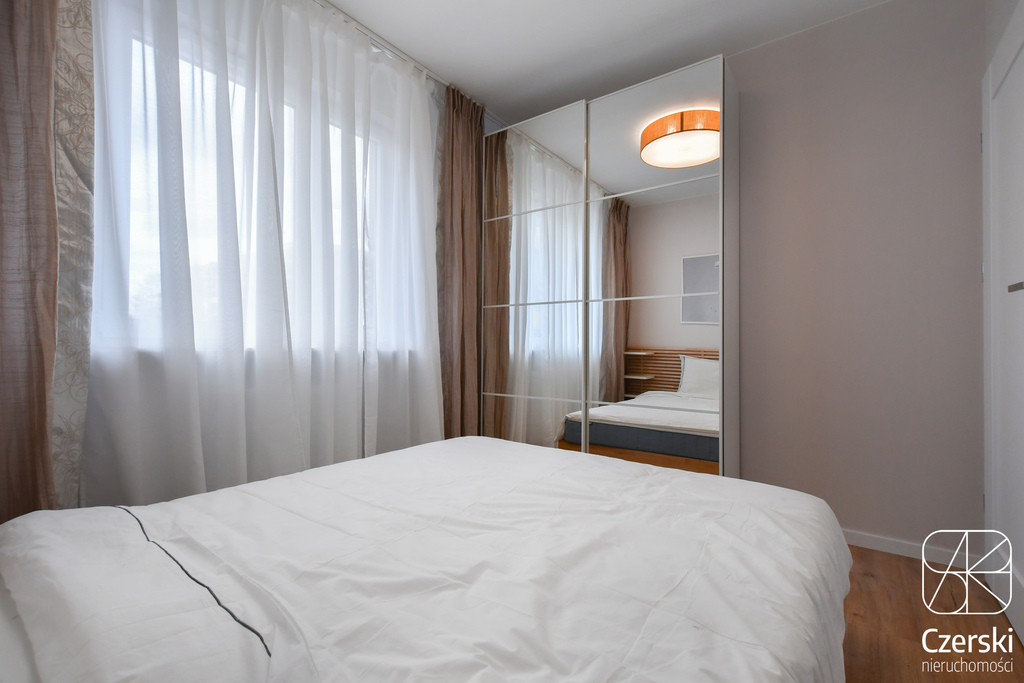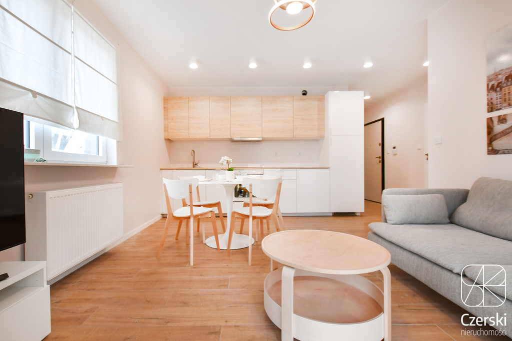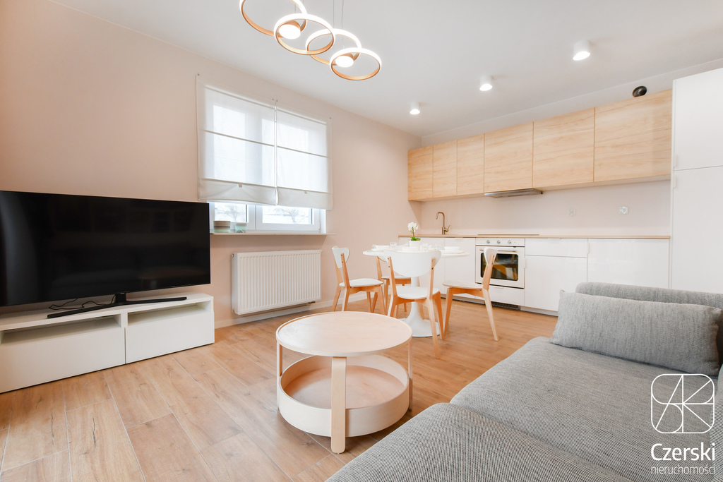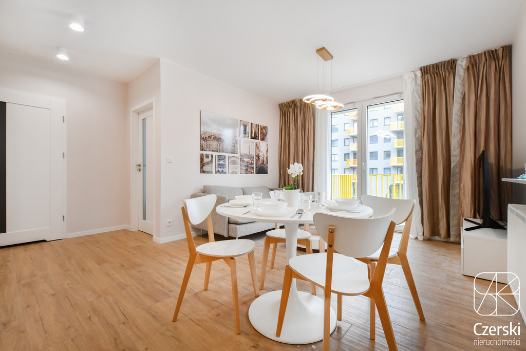 Prezentowane przez Nas 3-pok. mieszkanie o powierzchni 45 m2 usytuowane jest na pierwszym piętrze. W skład mieszkania wchodzi salon z aneksem kuchennym, dwie sypialnie, łazienka, hol oraz balkon. Mieszkanie dzięki swojej ekspozycji południowo-wschodniej, będzie jasne od wczesnych godzin. W całości zostało zaprojektowane przez biuro architektoniczne oraz wykończone w wysokim standardzie z dbałością o najmniejsze detale. Dzięki temu mieszkanie ma niepowtarzalny klimat. Na podłodze położone zostały płytki w ciepłym odcieniu w łazience znajdziemy płytki o tym samym wzorze. Fronty kuchenne są lakierowane na biało, a górne szafki w kolorze jasnego drewna. Znajdziemy tam wszystkie najpotrzebniejsze sprzęty jak płyta indukcyjna, piekarnik, zmywarka, lodówka i pralka a wszystko w zabudowie. Przed aneksem kuchennym jasny drewniany stół wraz z krzesłami tworzący część jadalną salonu który znajduje się za częścią jadalną. W salonie znajdziemy sofę wraz ze stolikiem kawowym przed którym znajduje szafka RTV z TV. W większej sypialni znajdziemy podwójne łóżko oraz pojemną szafę. W drugiej sypialni pojedyncze łóżko wraz z biurkiem do pracy i szafą. Łazienka wyposażona jest w prysznic, dużą umywalkę i toaletę. Dodatkowo do mieszkania przynależy balkon co niewątpliwie jest znacznym atutem. Ogrzewanie oraz ciepła woda pochodzi z sieci miejskiej. Do mieszkania przynależy również miejsce postojowe w garażu podziemnym oraz komórka lokatorska dodatkowo płatne.