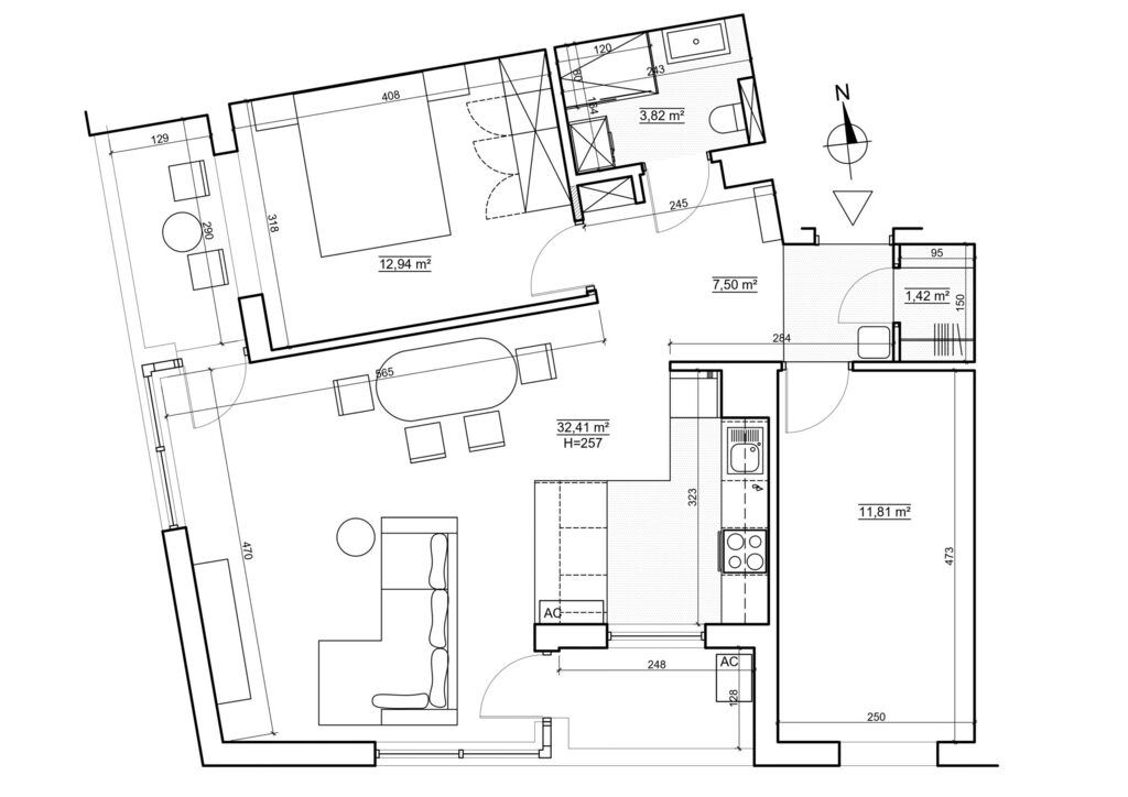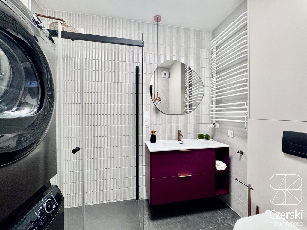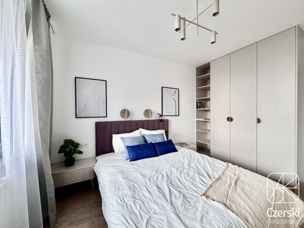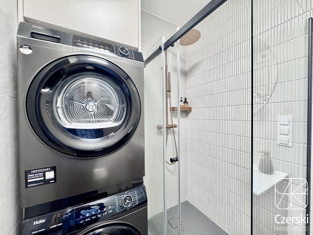 The 69.8 square meter apartment is located on the second of five floors. It consists of a living room with kitchenette, two bedrooms, a bathroom and two balconies. The apartment is fully equipped and furnished. The living room is equipped with a corner sofa, a coffee table and an RTV cabinet, there is also a dining corner. The kitchen is equipped with all household appliances and a large number of cabinets thanks to the island, which makes it spacious. The bedroom has a double bed, bedside tables and a spacious wardrobe. There is a small wardrobe (1.43 m2) in the hall. The bathroom is equipped with a shower, a sink with a mirror, a toilet and a washing machine with a dryer. Heating and water are distributed from the city network, which affects the low maintenance costs of the premises. The apartment is finished in a Scandinavian style, in white and gray colors.